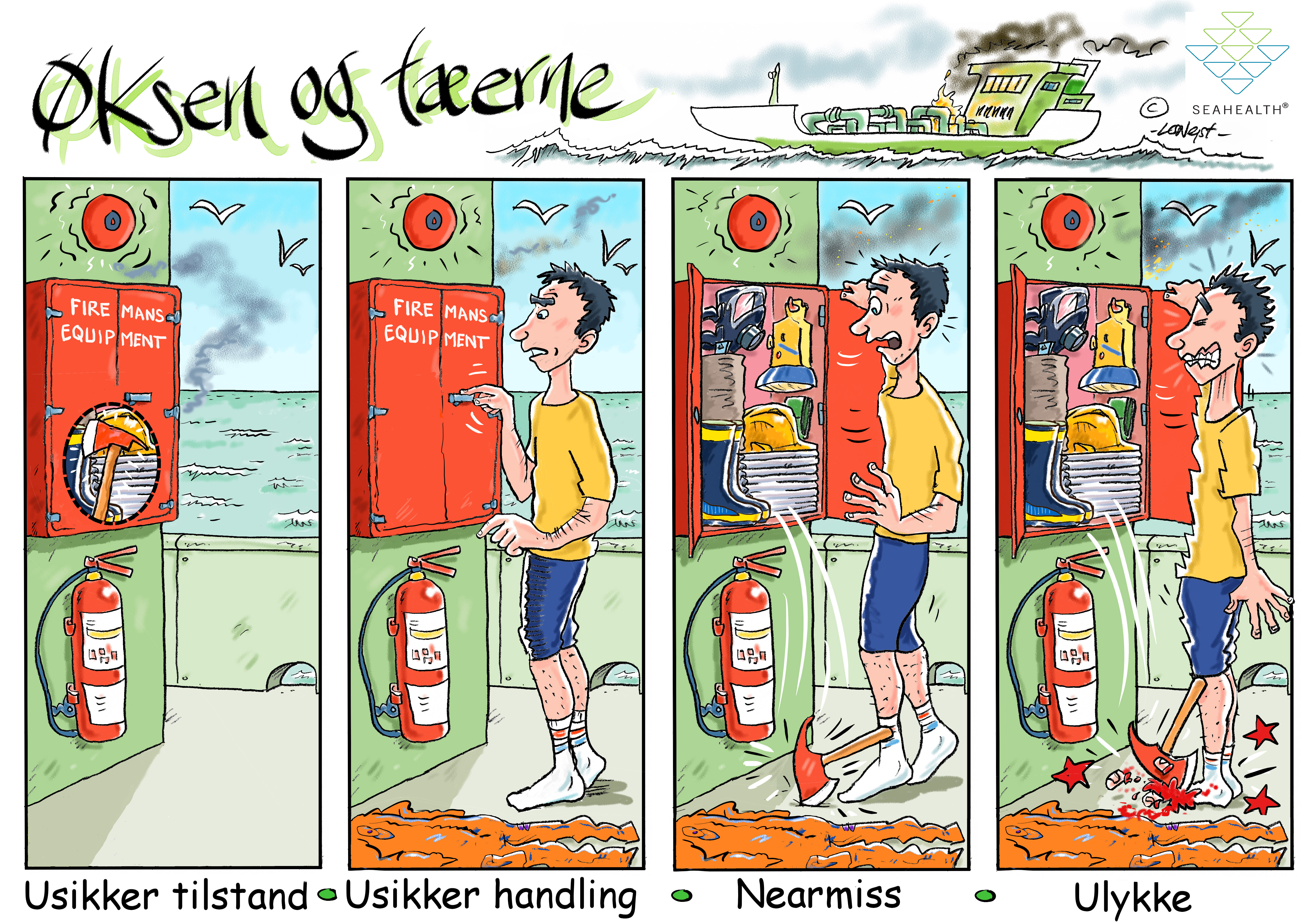 SEAHEALTH er klar over, at måden hvorpå ulykker sker, er mere kompleks end blot at opfatte dem som en række af hændelser, som her vises - men som en start bliver vi nødt til at tro på, at de fleste af grundene til ulykker kan opdages ved at spotte de farlige arbejdsprocesser fra venstre.